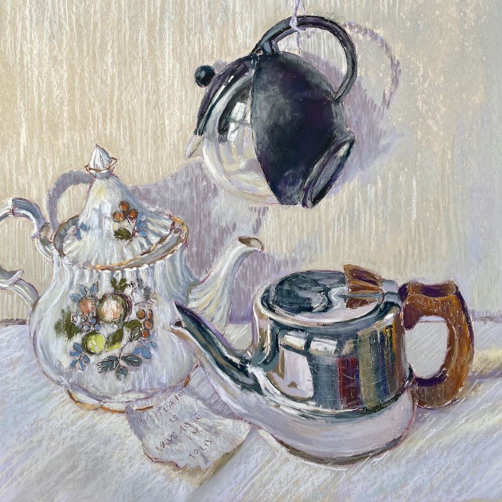 Tea is never just about tea. It is about listening, sharing, putting the world to right, calming nerves, laughing and crying. It’s about life shared. I am aiming to create a series of teapot paintings that bring together these life experiences, represented by each teapot, together in pastel. This is the first of what will hopefully become a series. The title comes from the handwritten note found inside one, written by the owner’s mother, some 20 years ago, This Teapot is Valuable I am Told. Apparently, the teapot turned out not to be valuable in monetary terms but does have great sentimental value.