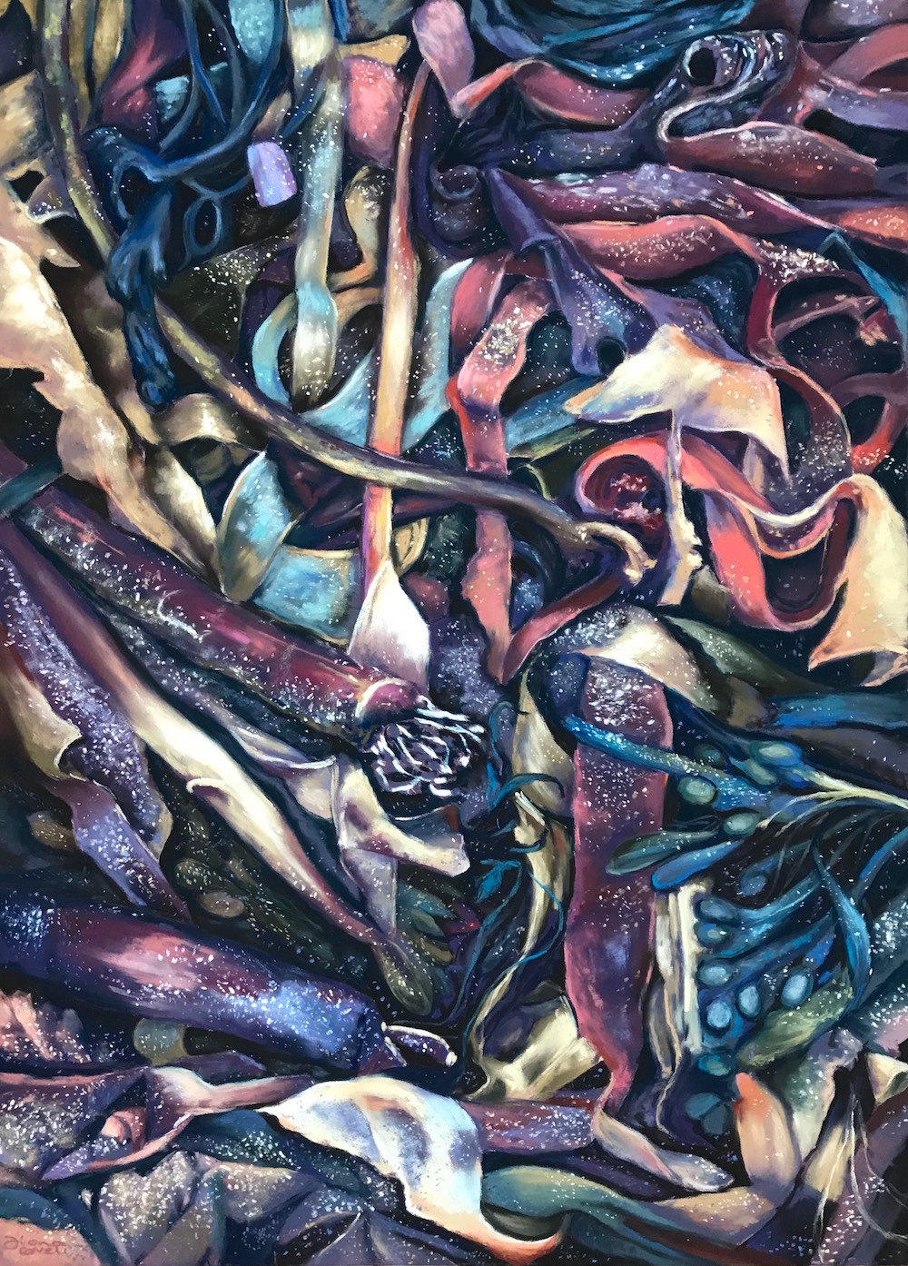 I wasn’t sure how my first seaweed painting, Treasure of The Deep, would turn out. It was huge (over a metre high once framed) and took me 6 weeks of incredibly detailed, complex pastel work to complete. Painting it was torturous. For someone with little patience, this tested both my technical skill and faith in myself, but I knew it was the only way to create the outcome I wanted. I needed to draw the viewer in, to see what I could see – all that incredible beauty, something from another world, something that should indeed be treasured. Treasure of The Deep was sold at exhibition in Northumberland and a few smaller seaweed paintings followed but it took a lot for me to muster the energy to tackle another large-scale seaweed painting as they are so incredibly time-consuming, but nothing prepared me for Fire of The Deep.