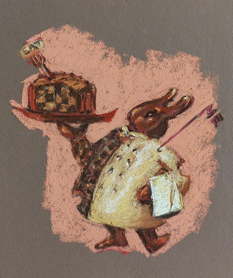 Nicolette van Dam, H. Hatter, 8 October 2023, Schmincke pastels on Canson Mi-Teintes Touch, 13 3/4 x 7 3/4 in. Alice met the scatterbrained Hatter at the mad tea-party.