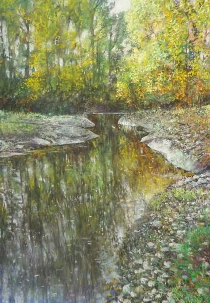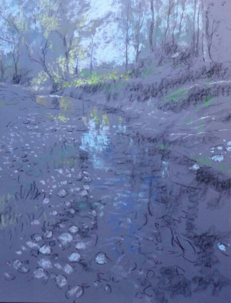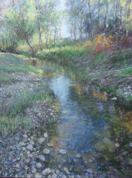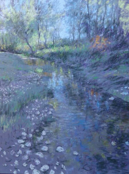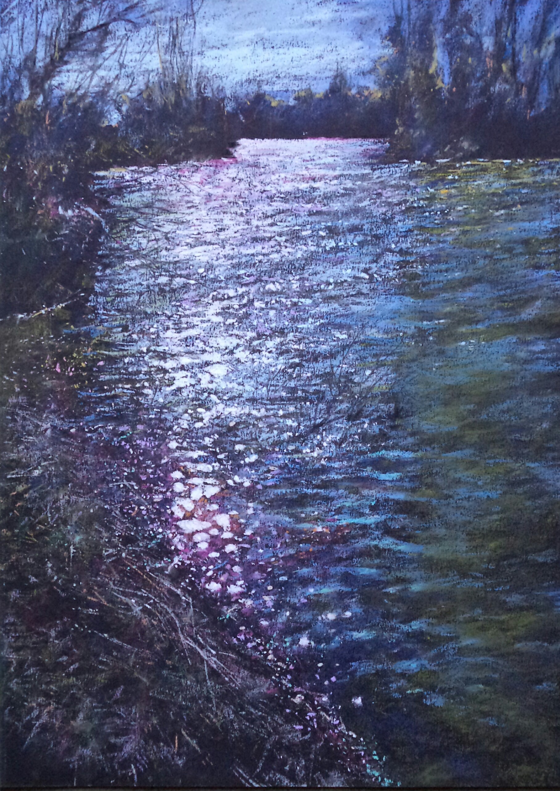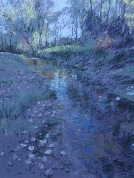 I’m a bit late to the party on this one. When I first started to use pastel I always found the darker papers more effective, I liked the way that pale colours stood out; and how it was possible to build the image and bring it up and out of the darkness of the paper. Alain’s use of black is unusual but the results look great, certainly works beautifully for his landscapes. I especially like “Return of the Night”….I’ve often stood on a riverbank when the light has faded right down and then seen this intense sparkling light on deep shadowy water.