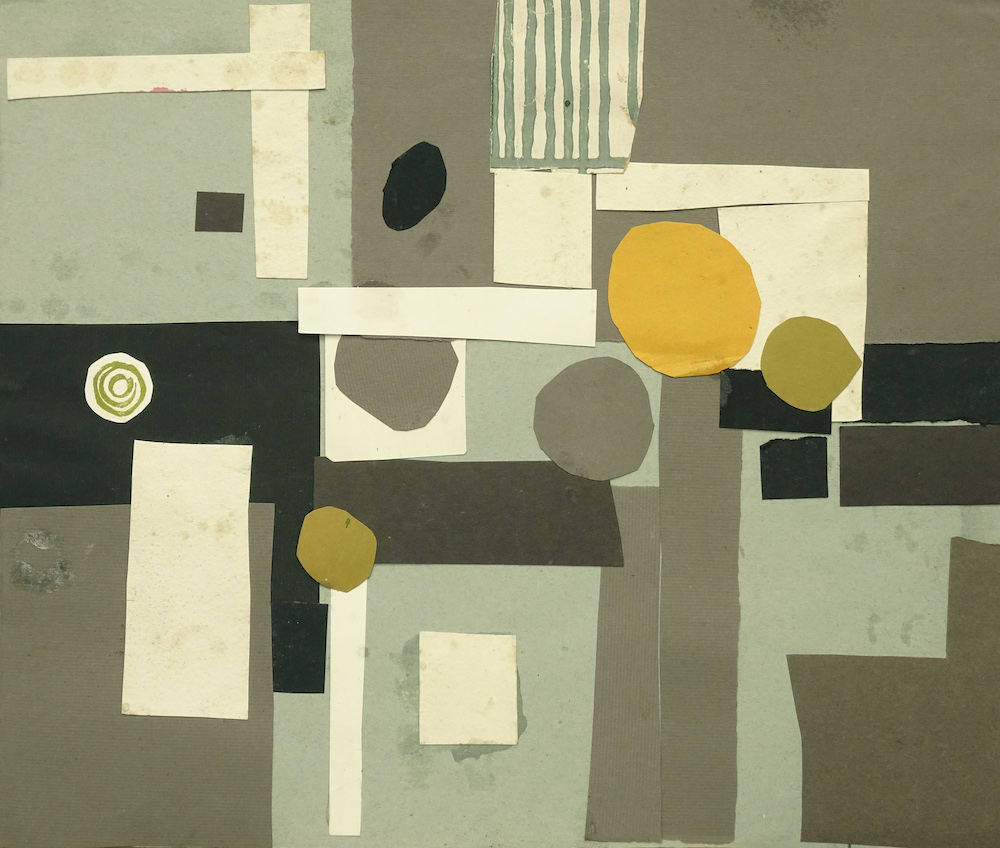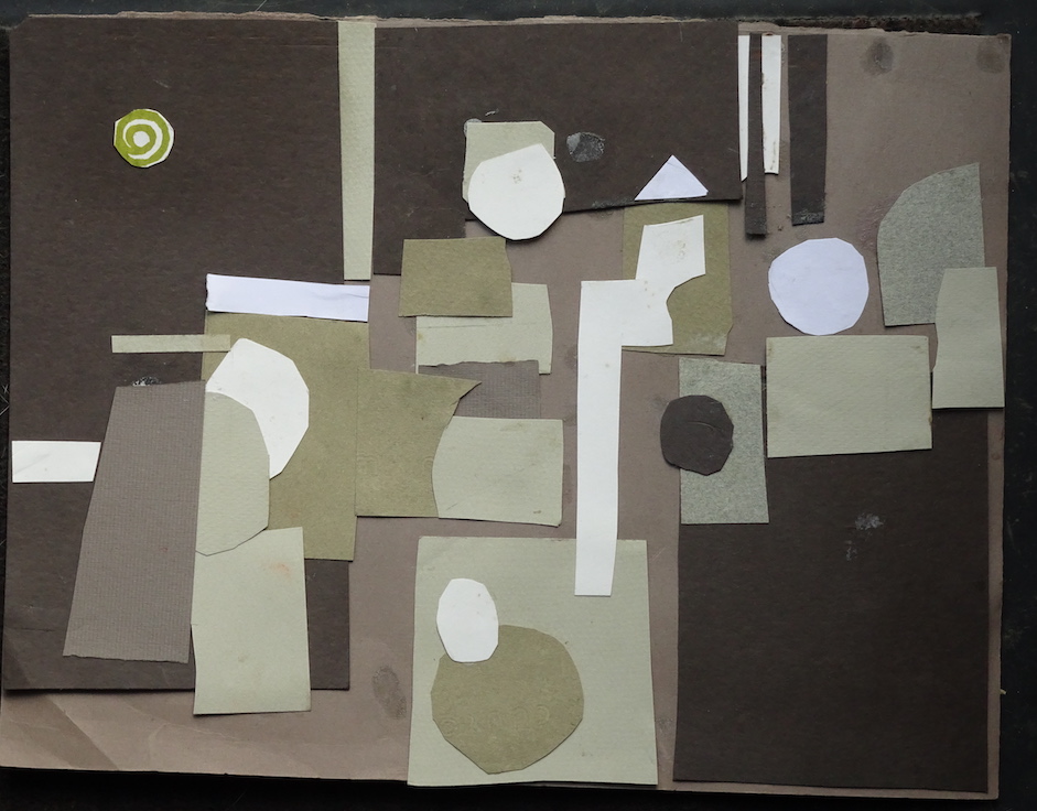 Sometimes I create a collage and will view it upside down or on its side to seek out the right composition balance, then I will study it for a while until a subject matter suggests itself. In this instance, the collage inspired a still life painting.