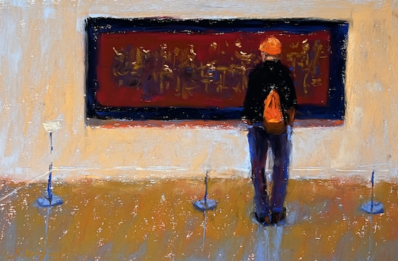 As I read about your day at the Tate and looked at the photos you posted, the first thing that came to my mind is that you must have based your piece ‘There’s One in Every Crowd’ on the photo you had taken of the entrance to the Tate (I noticed right away that the lines of the piece, and even the angle of the lines, echo those of the Tate’s entrance in the photo). Because of your other posts, I know that you often study and photograph the people at galleries and other places as much as you do the paintings/objects. I thought that perhaps your pastel was based on that one ‘stand-out’ person at the Tate that day. Then, I went to your post about how you created that abstract, and it was dated Feb 2019. So, the abstract wasn’t based on your Tate visit. Except…maybe there really WAS a connection, but it happened in ‘dream’ and not ‘linear’ time.
